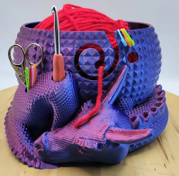 This dragon-themed yarn bowl isn't just a work of art; it's a functional organizational masterpiece. Two storage holes are cleverly incorporated to hold your hooks, knitting needles, scissors, or any other knitting accessories you need. You can even keep your stitch markers organized! Keep everything at your fingertips, ensuring a seamless crafting experience.